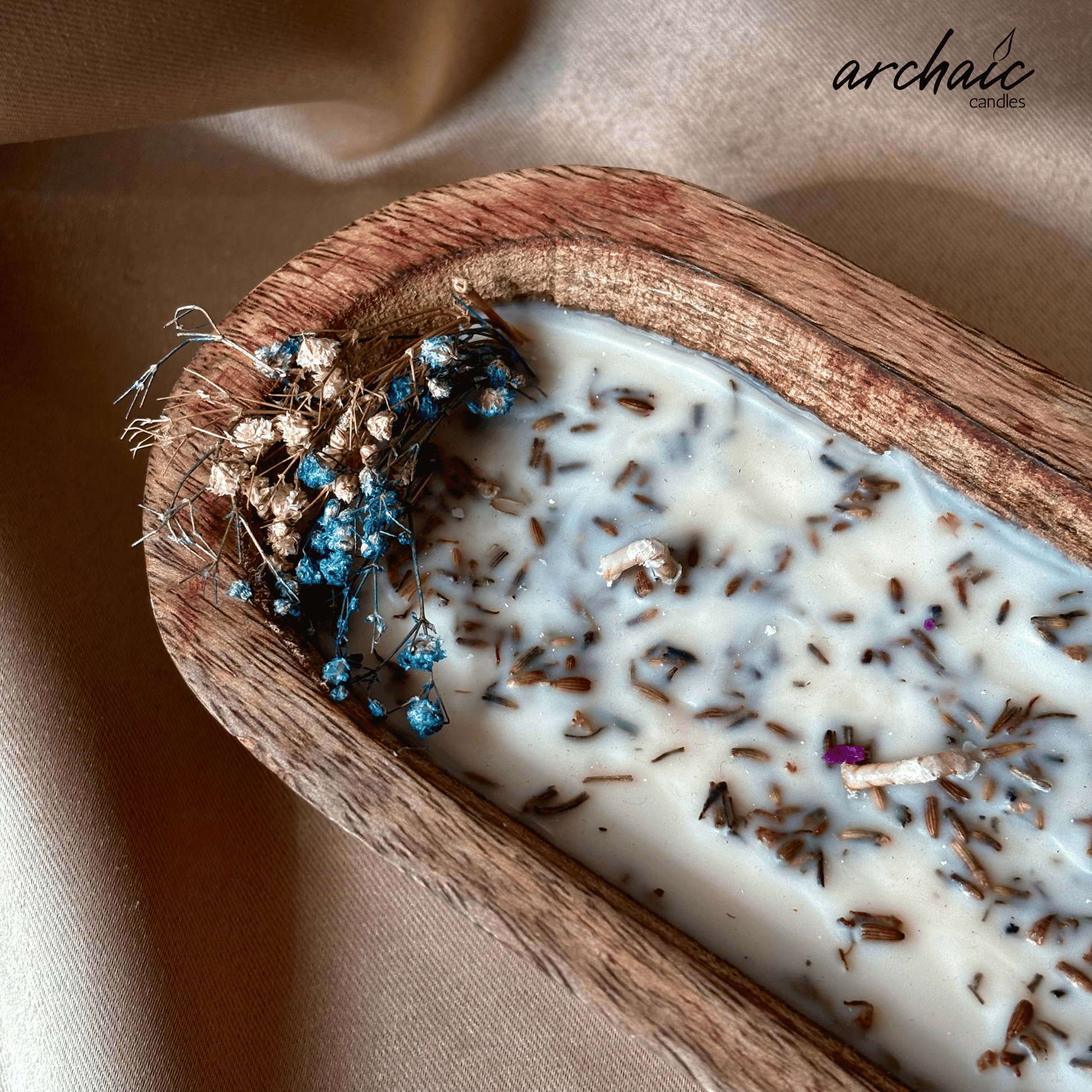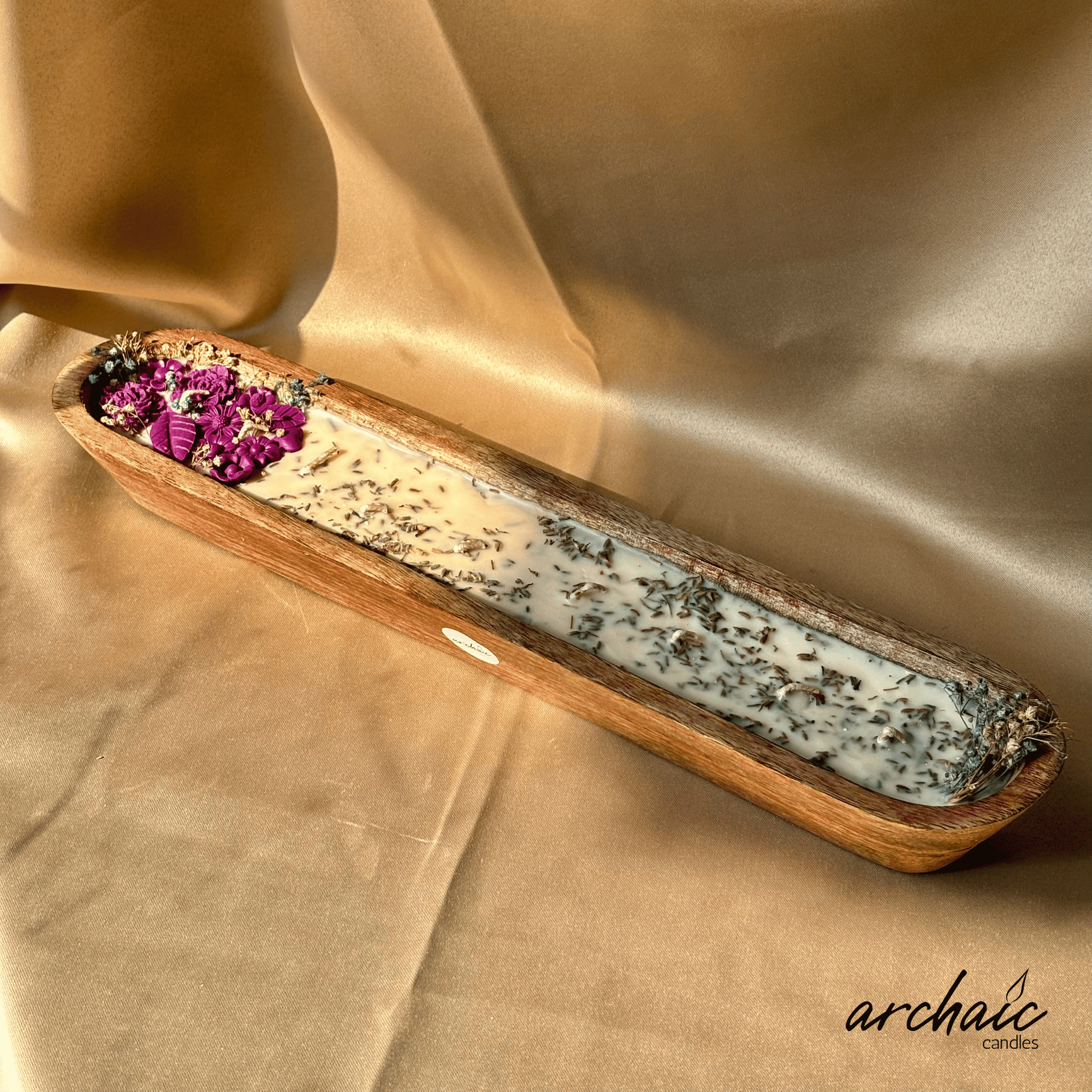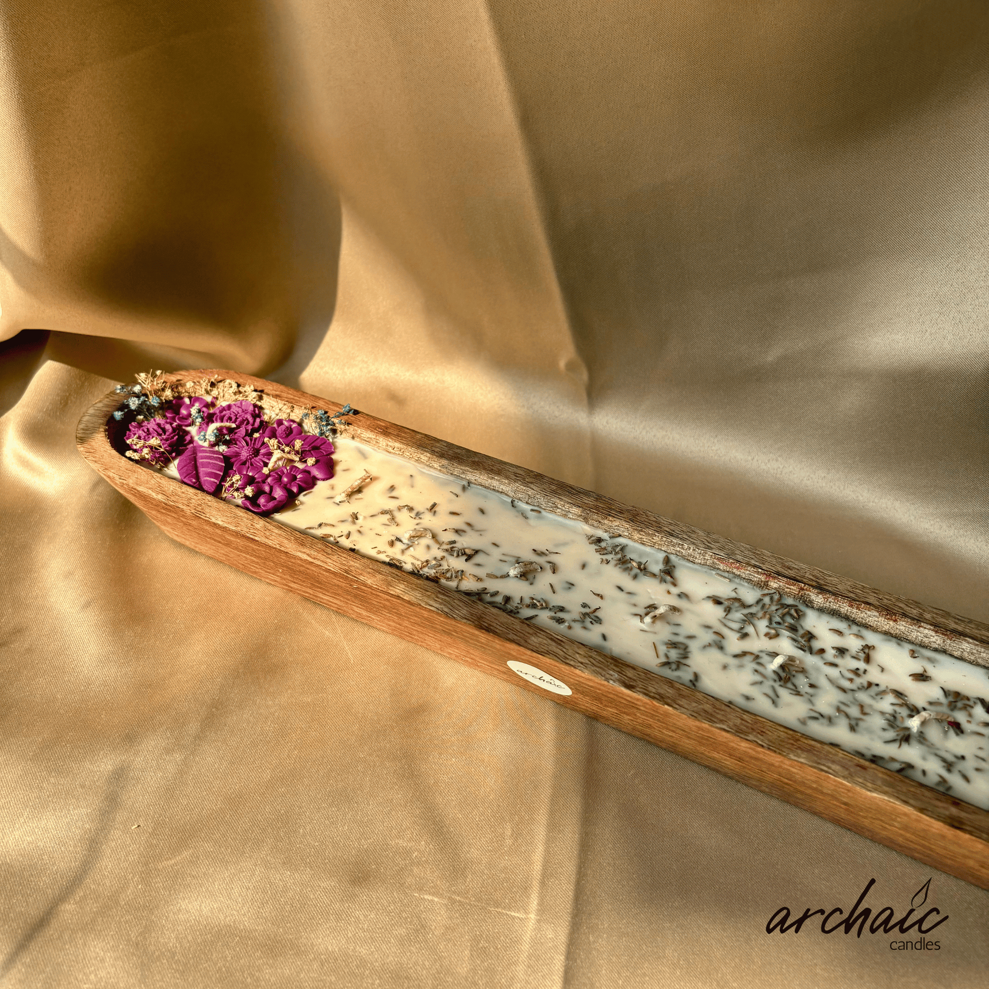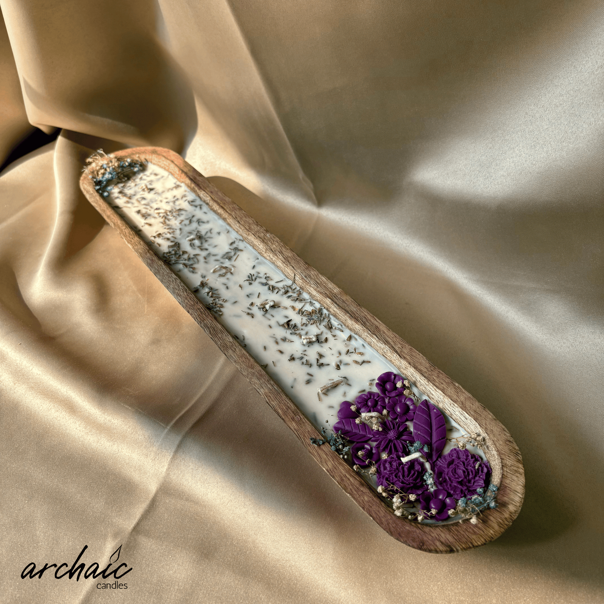 Immerse your senses in tranquillity with Amethyst Tide, our Purple Lavender Wooden Boat Candle, hand-poured in small batches with pure soy wax and adorned with dried lavender petals. Housed in a grand 18-inch hand-carved wooden boat, it’s designed to be both a striking centrepiece and a sanctuary of calm. The white wax base contrasts beautifully with delicate purple wax flowers and leaves resting at one end — a perfect harmony of art and aroma.
