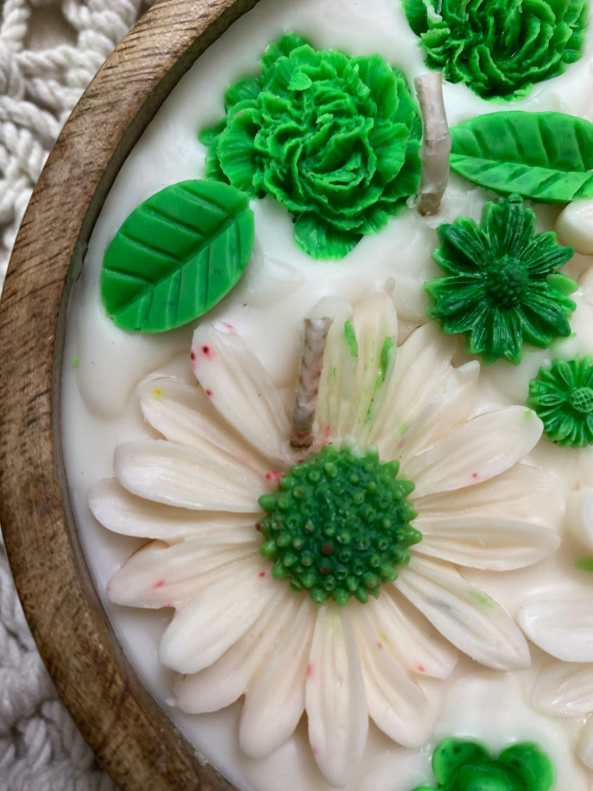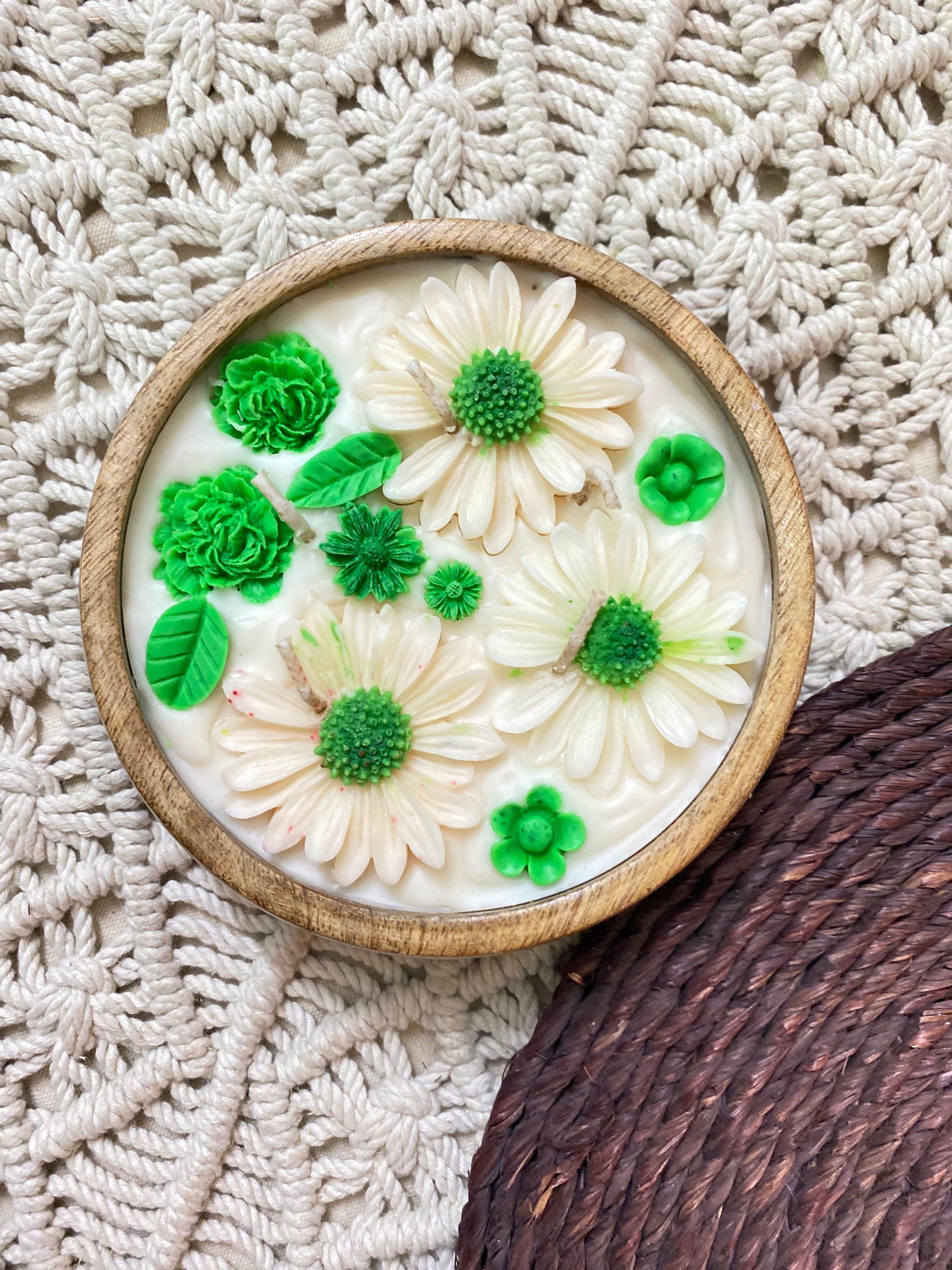 Lemongrass Wooden Bowl Candle – Handcrafted with Pure Soy Wax with Floral Design