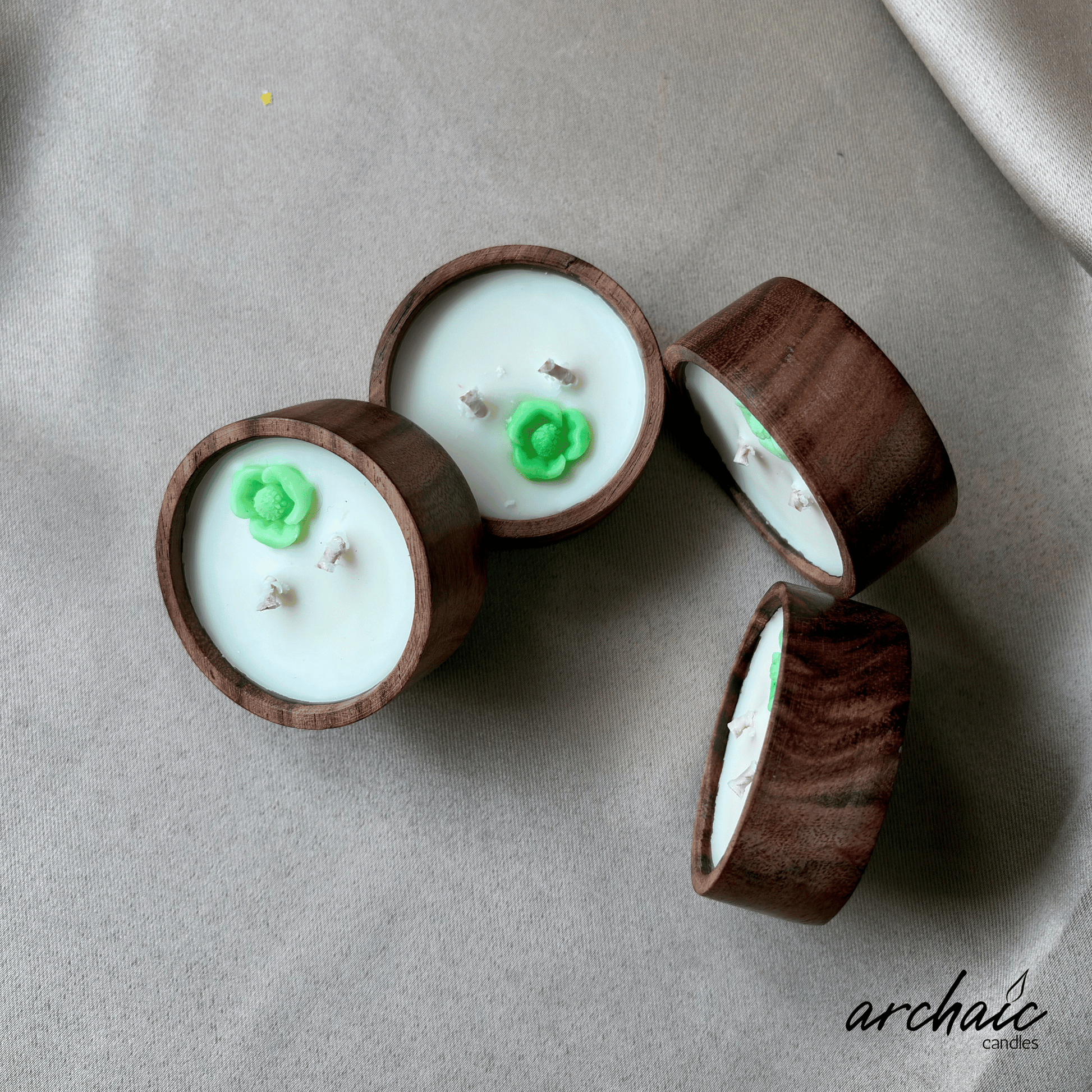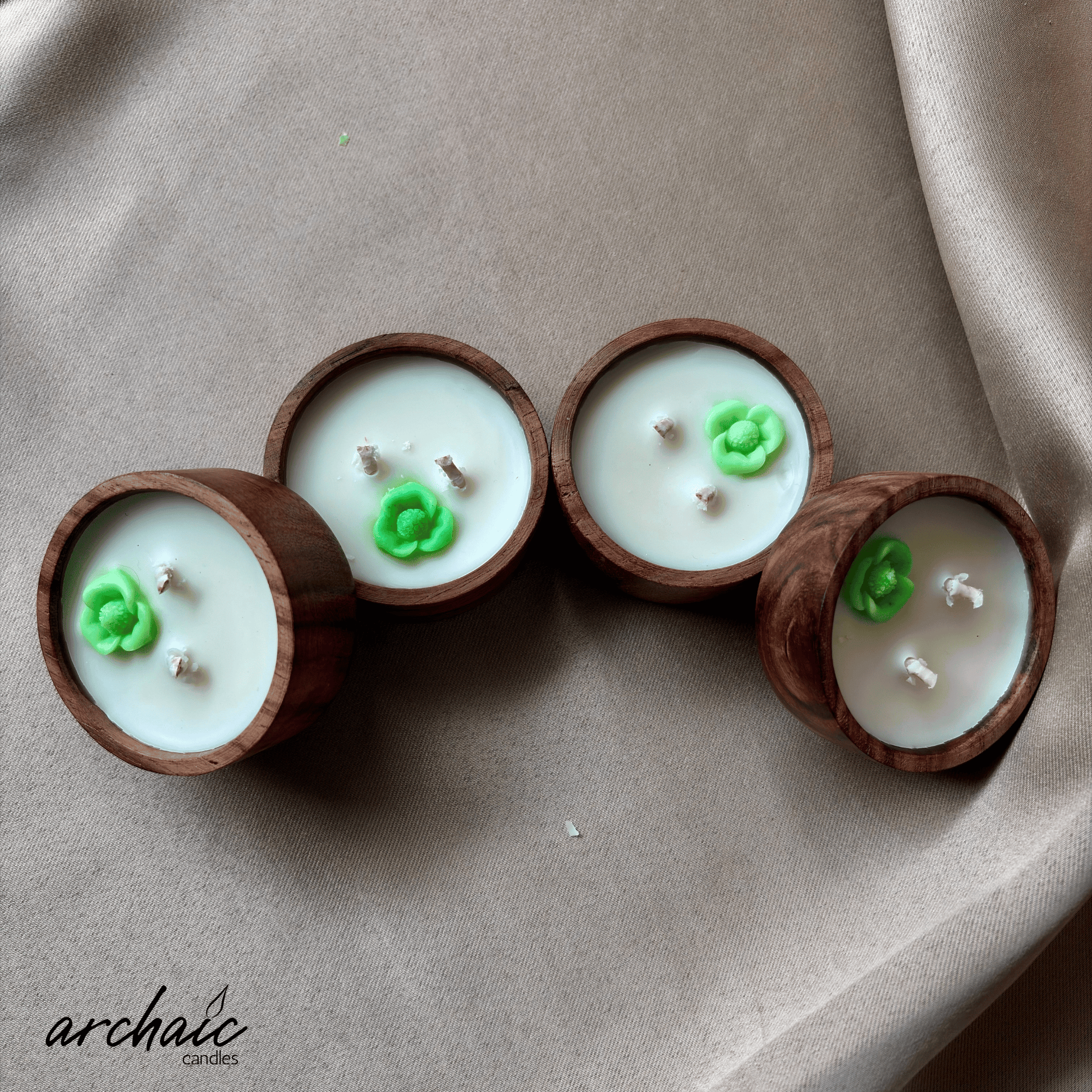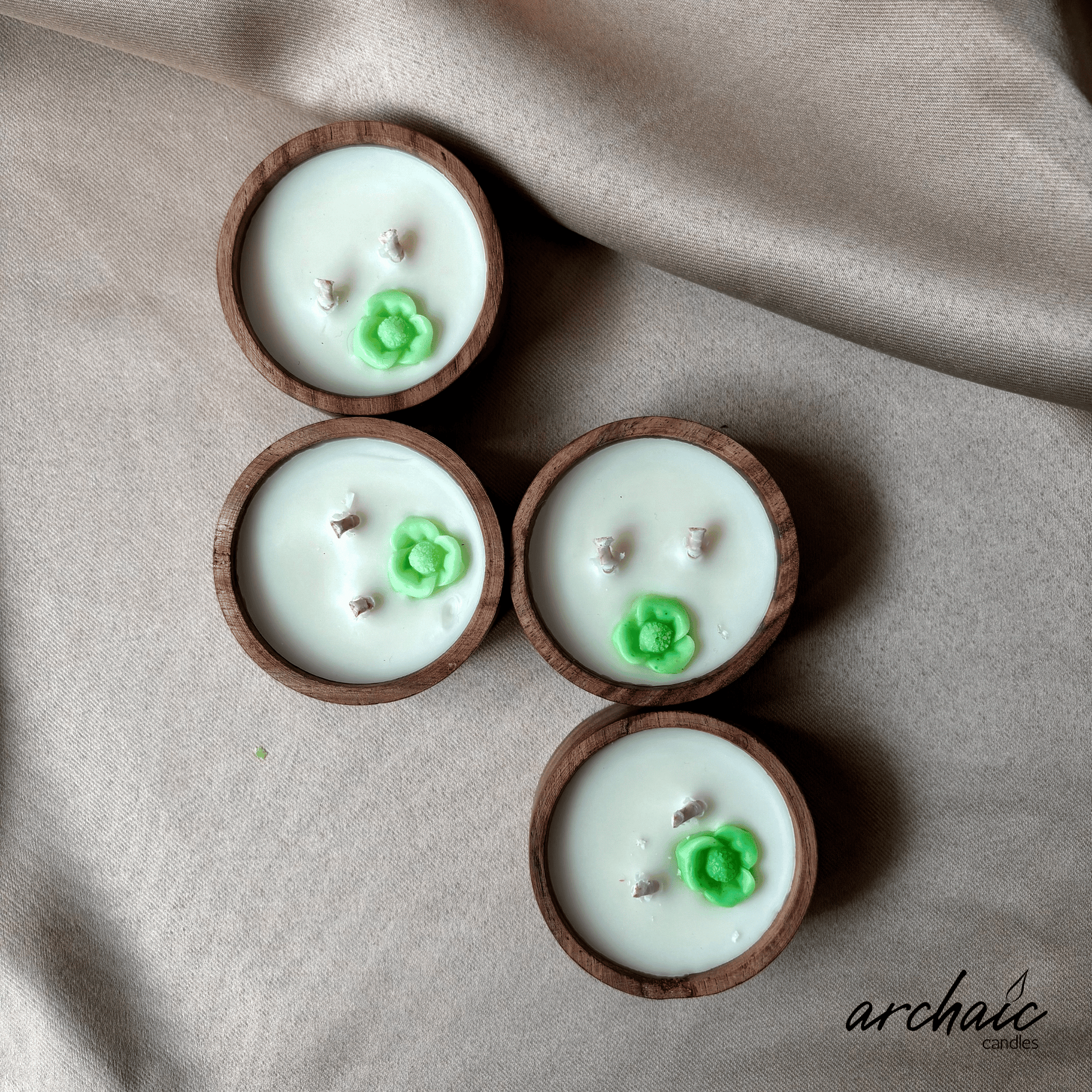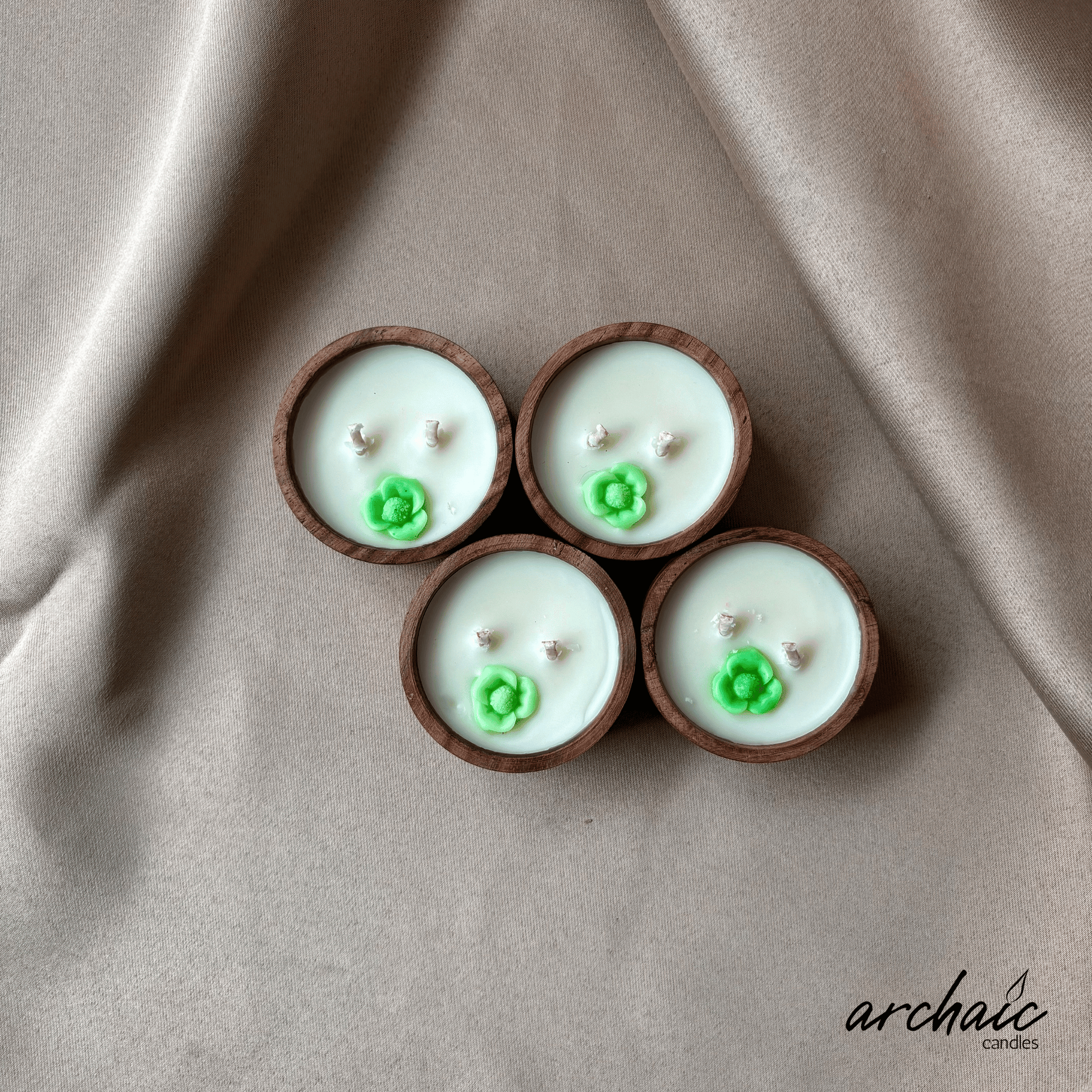 Wooden Small Circle Green Flower candle | Emerald Bloom| Pure soy wax candles
