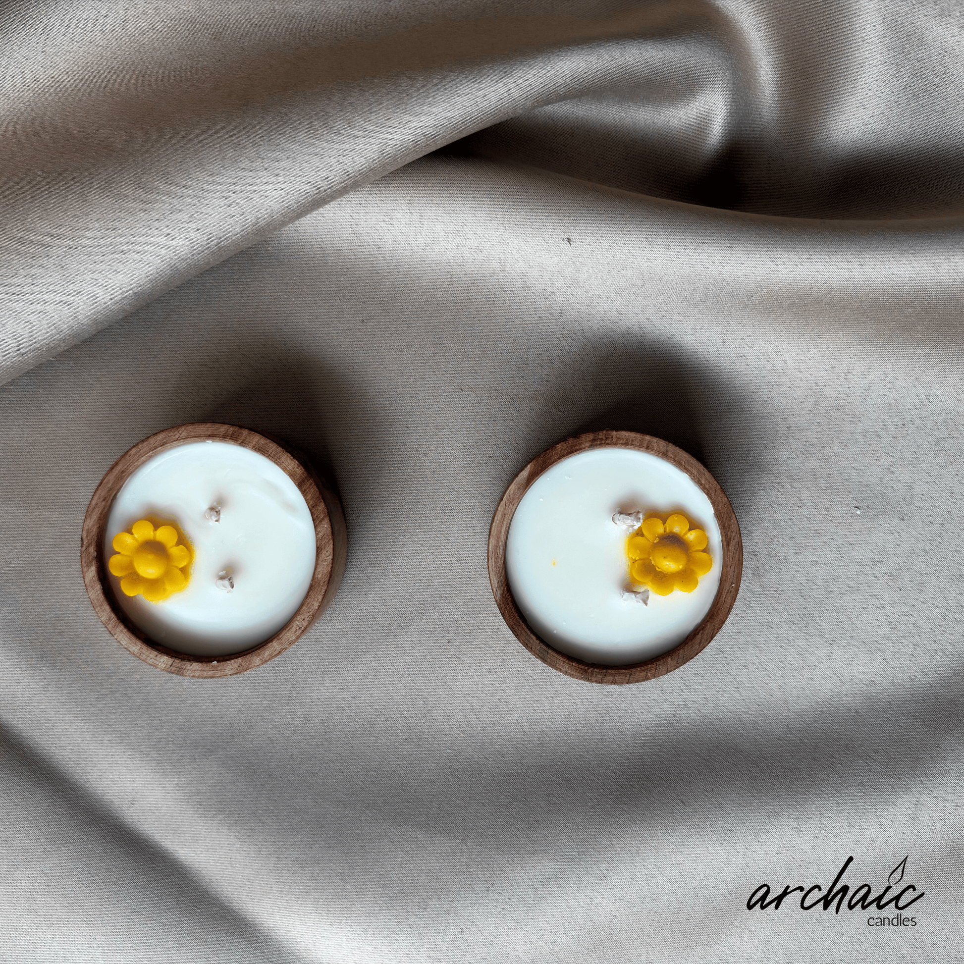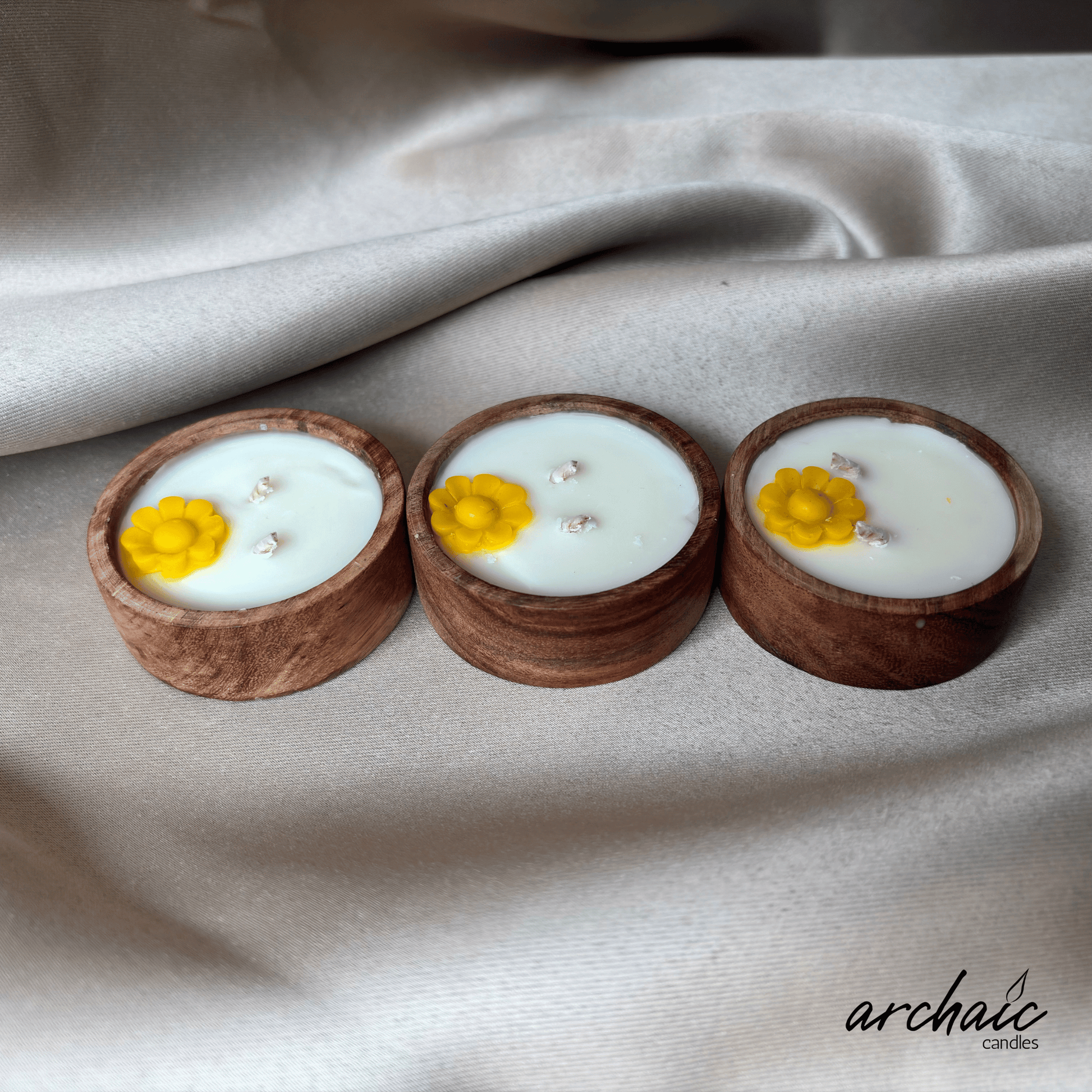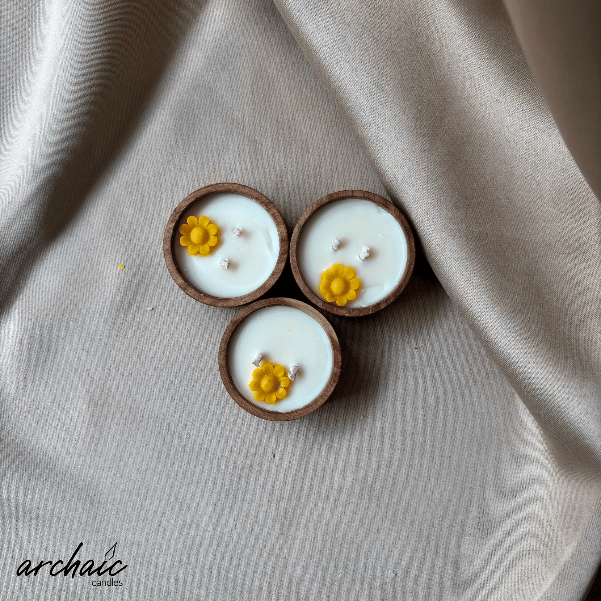 Wooden Small Circle Yellow Flower candle |Sunny Bloom| Pure soy wax candles